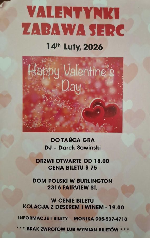 Polish Hall in Burlington located at 2316 Fairview St. Burlington, would like to invite you to the Valentines Day Dance on Feb. 14th 2026 at 7 pm. Doors open at 6:30 pm. Tickets are $ 75 per person. Include dinner, desert and wine. Dj Darek Sowinski - playing.